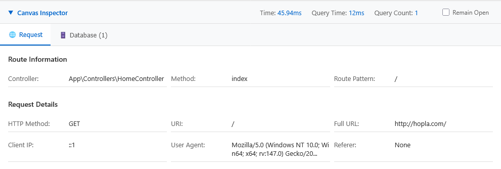 The Canvas Inspector is a debugging tool that provides insights into your application's performance, database queries, and request processing. After your controller executes and returns a Response, the Inspector injects a debug toolbar into HTML responses.